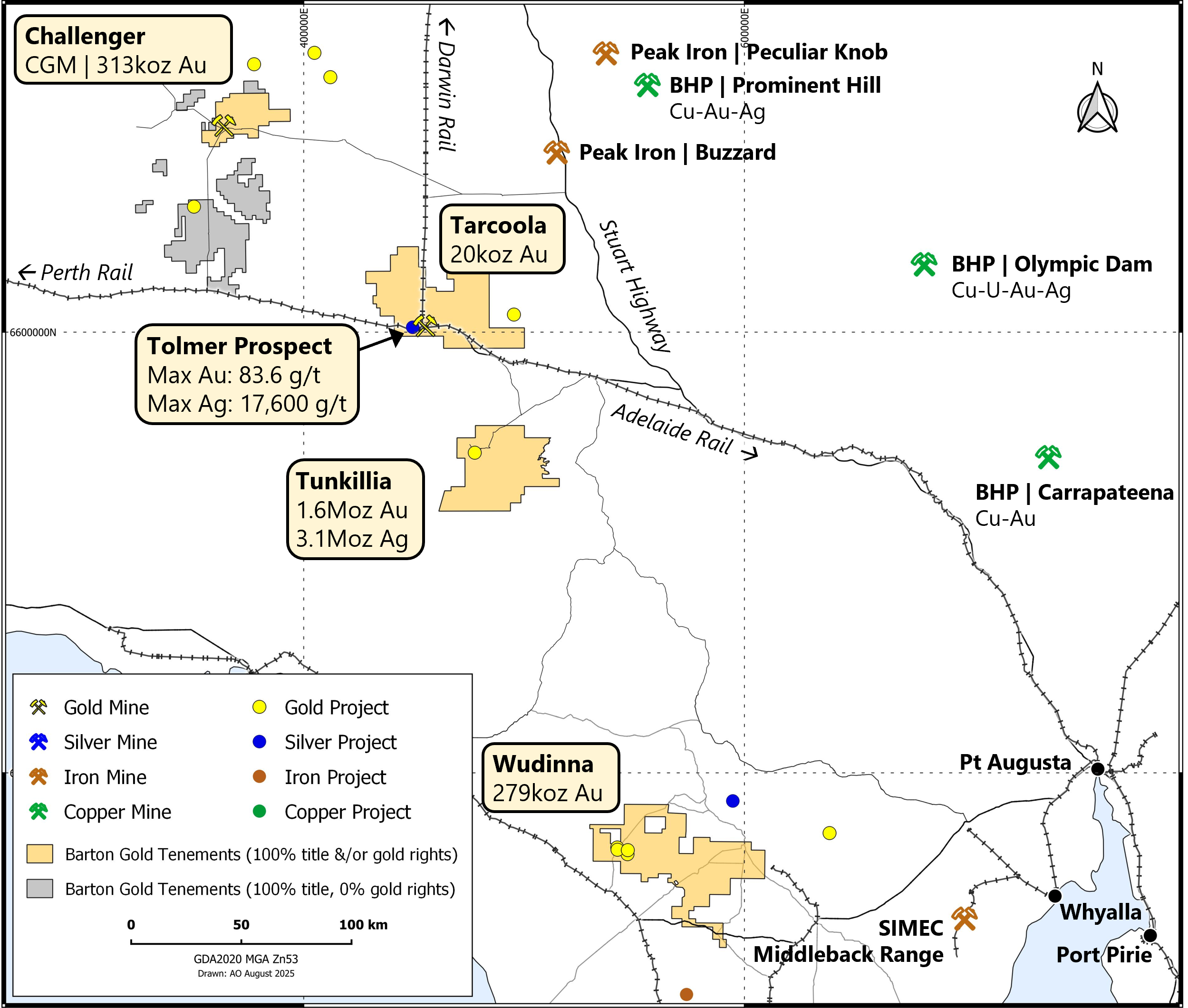 Barton has over 5,000 km2 mineral tenure across four key projects in the richly mineralised central Gawler Craton of South Australia, all grouped near key road and rail infrastructure. Barton also owns the region’s only gold mill.