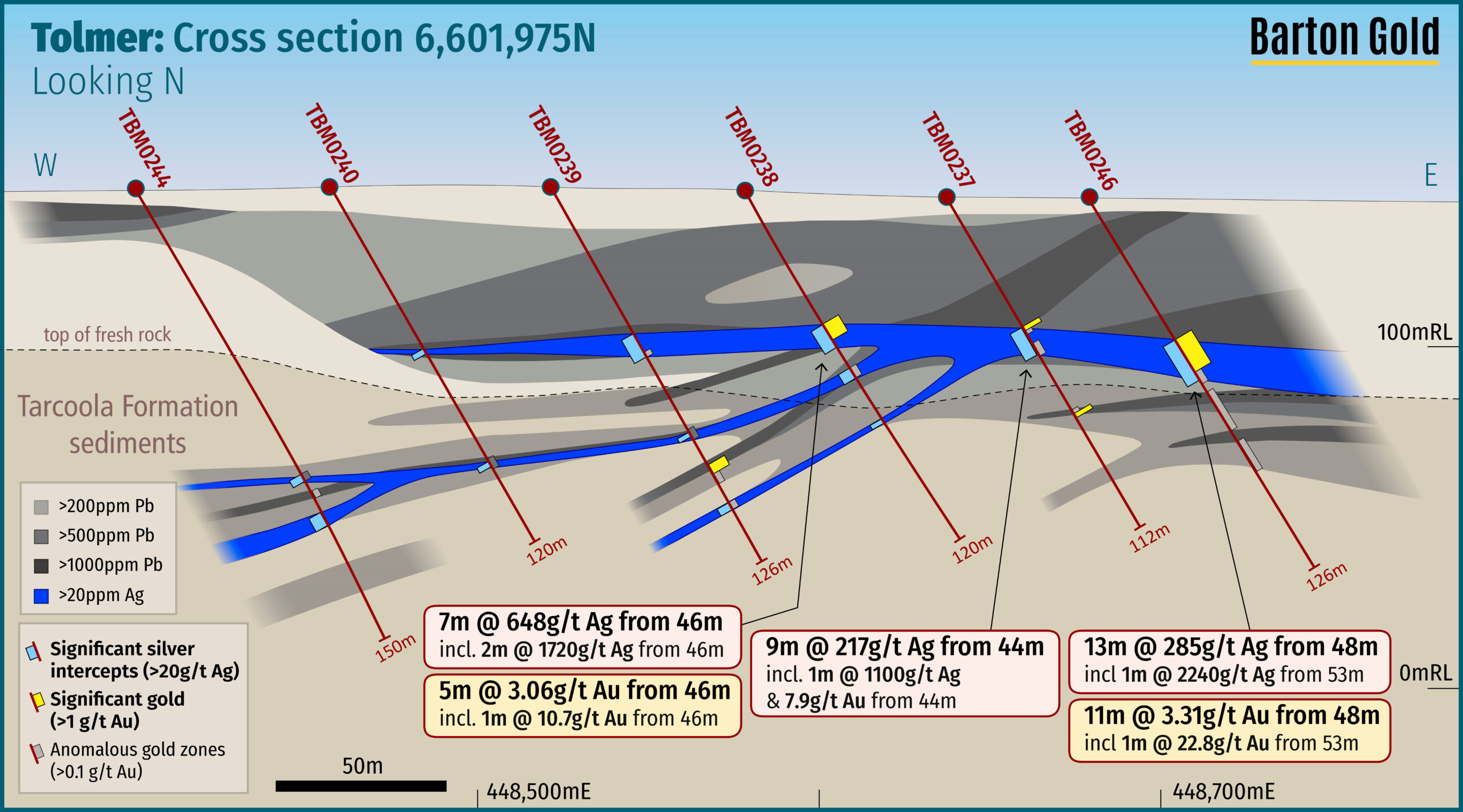 Subsequent follow-up drilling during late 2024 and 2025 then identified a second zone of mineralisation located ~500m to the west of the original Tolmer discovery. Drilling identified considerably higher silver grades of up to 17,600 g/t Ag, plus accessory gold of up to 51.2 g/t Au.