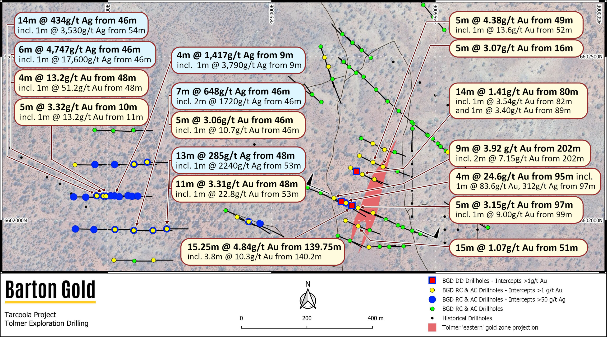 Tolmer is located ~5km W of Tarcoola and ~130km SE of the Central Gawler Mill (Challenger), and is the site of Barton’s recent dual high-grade silver and gold discoveries in the ‘western silver zone’ and the ‘eastern gold zone’. The ‘western silver zone’ is notably silver dominant mineralisation.