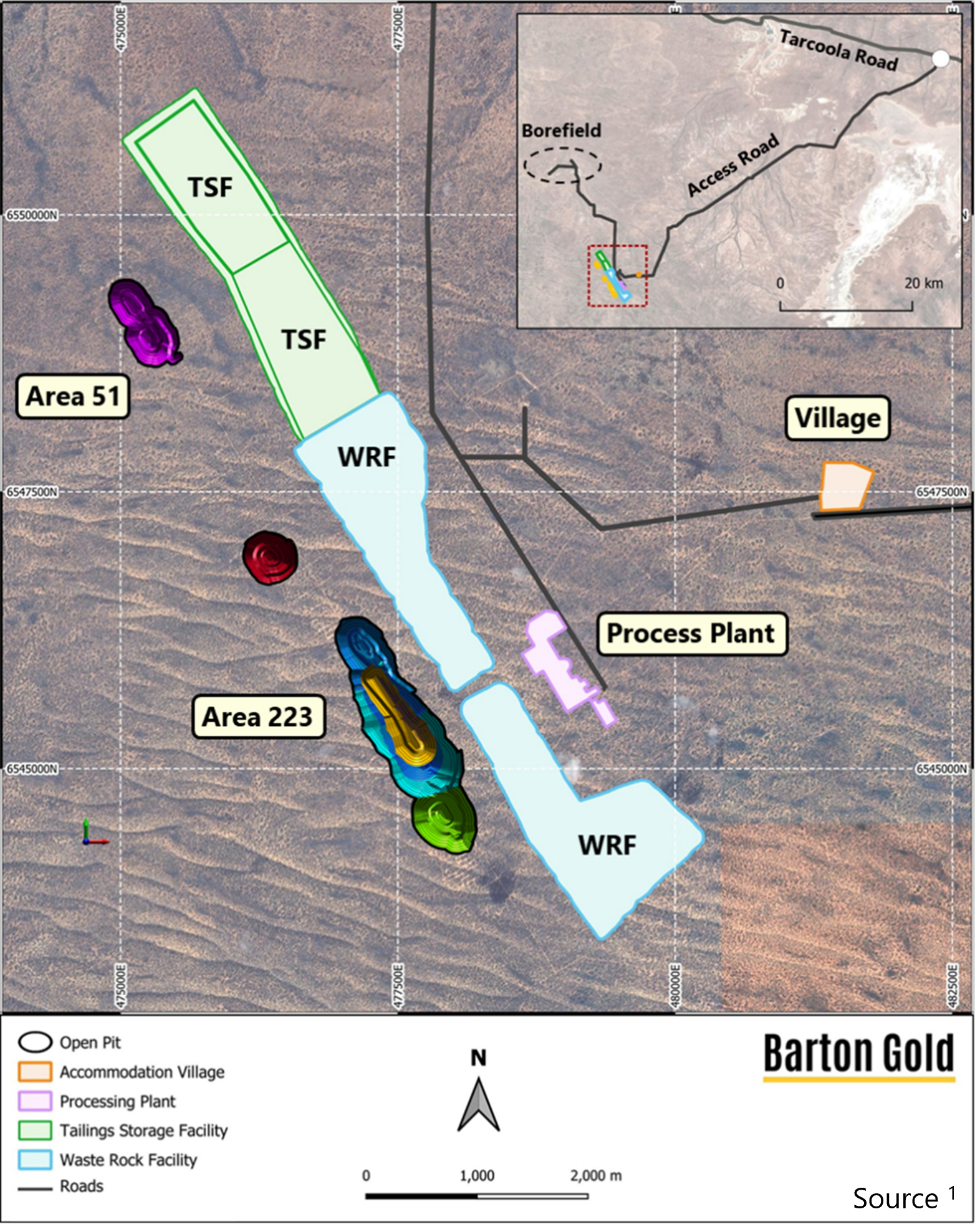 Tunkillia is located ~70km S/SE of Tarcoola, and is the site of Barton’s planned future ‘Stage 2’ growth project incorporating large-scale bulk open pit operations, a new high-efficiency bulk processing gold mill, and supporting infrastructure including a large village, airstrip and power.