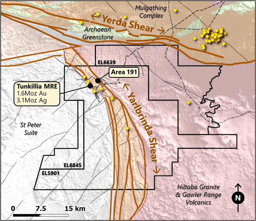 The project hosts more than 30km strike extent of the highly prospective Yerda and Yarlbrinda Shear Zones which are several kilometres wide and analogous to major Kalgoorlie Shear Zone systems. The project area has seen very little exploration outside of the current Mineral Resources area.