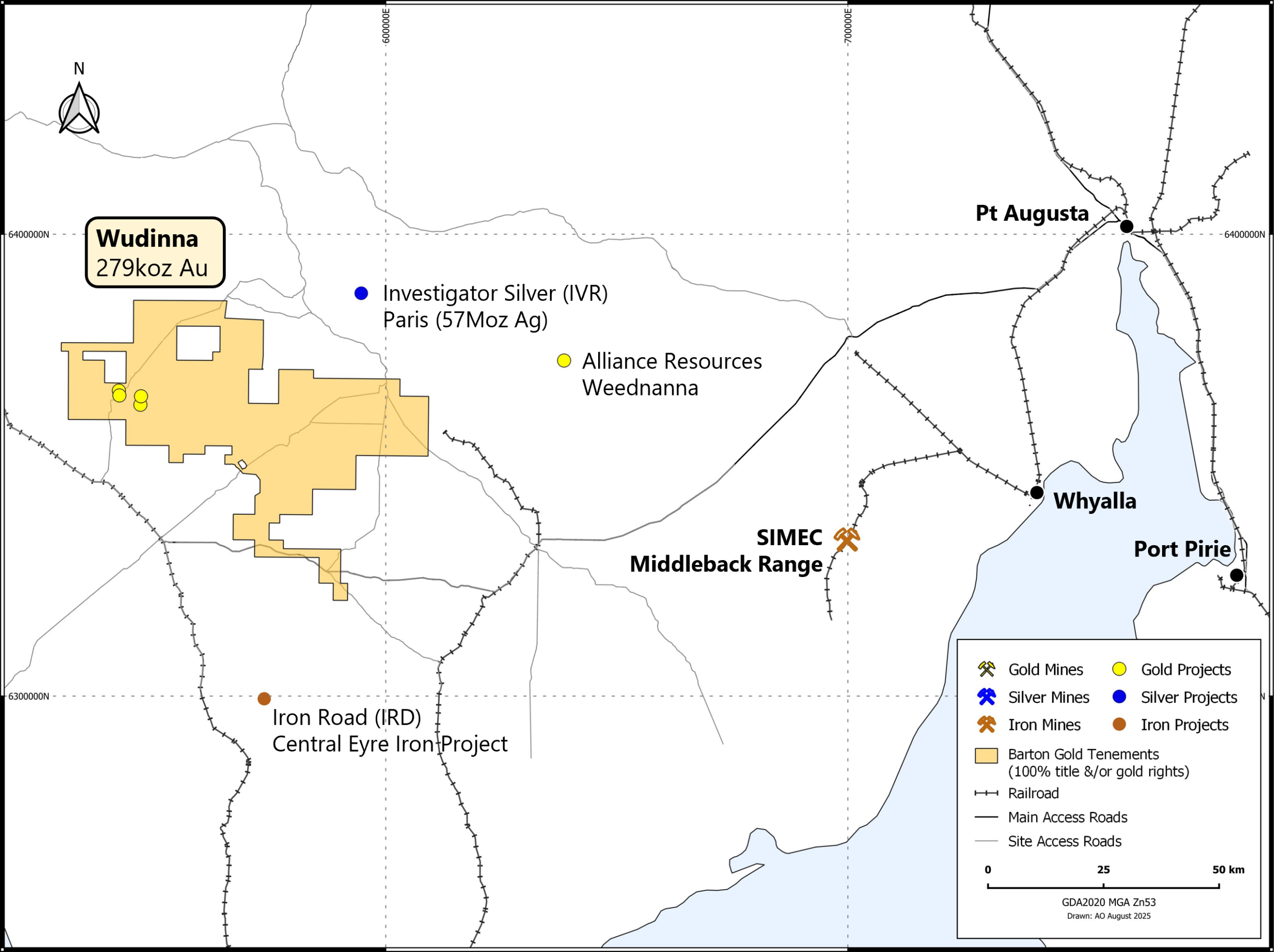Wudinna is located ~180km W of Port Augusta and ~200km SE of Tunkillia, near the main highway and secondary roads / tracks which connect Wudinna to the Central Gawler Mill, Tunkillia and three export terminals. Barton completed the acquisition of the Wudinna project rights during July 2025.